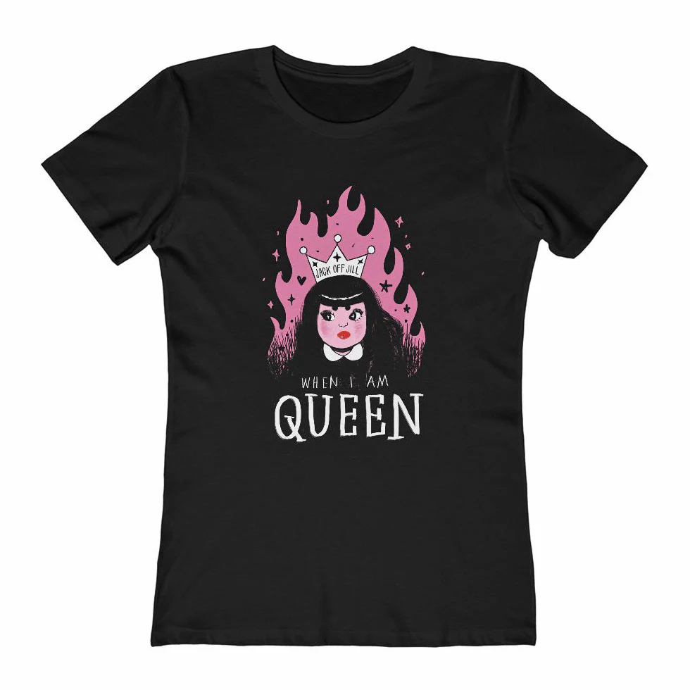 In collaboration with Jessicka Addams, Mel Stringer has created original designs to celebrate the 25th anniversary of Clear Hearts Grey Flowers. The 2nd piece in the series, titled “When I Am Queen” is inspired by the nostalgic, emotionally raw aesthetic of early Jack Off Jill artwork. Mel’s signature childlike and feminine style is boldly contrasted with the imagery from album lyrics, a visual metaphor that mirrors the spirit of songs on Clear Hearts, Grey Flowers: delicate, expressive, and unapologetically visceral.